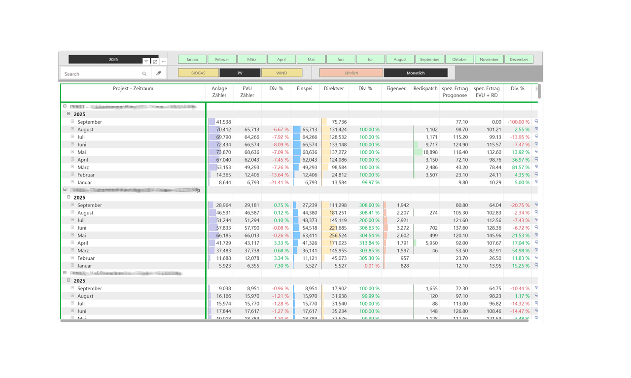 Die zweite Sicht bringt technisches Geschehen und kaufmännische Abrechnung zusammen. Monat für Monat werden Anlagen-Zähler und EVU-Zähler gegenübergestellt; die Abweichung in Prozent ist sofort erkennbar und wird entlang der Ertragslogik aufgeschlüsselt: Einspeisung, Direktvermarktung, Eigenverbrauch, Redispatch.
